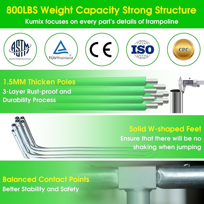 - 🏀Strong Frame and Stable Base: The big trampoline has 6PCS safety poles which were wrapped with soft foam tubes. 3pcs U-type legs keep the stability of the trampoline base. 48pcs 145MM springs matched with a jumping mat make the trampoline has extraordinary elasticity. The trampoline still can keep in a good condition after more than 20000times tests under more than 800lbs.