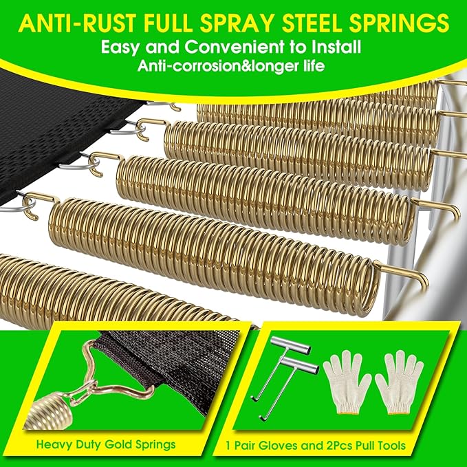 - 👍Enough and Extra Trampoline Accessories:8ft outdoor trampoline packed in 1 big box. Not only including all essential parts: 1 x removable ladder, 3 x w-shaped legs, 6 x enclosure net poles, 48 x springs, 2x T-hook, 1 x safety enclosure net, 1 x springs safety pad, 1 x jumping mat,1 x basketball hoop set. Additional including 1x rubber & pump, 1x trampoline water sprinkler, 8pairs trampoline socks (8 M + 8 L), 1x trampoline light.