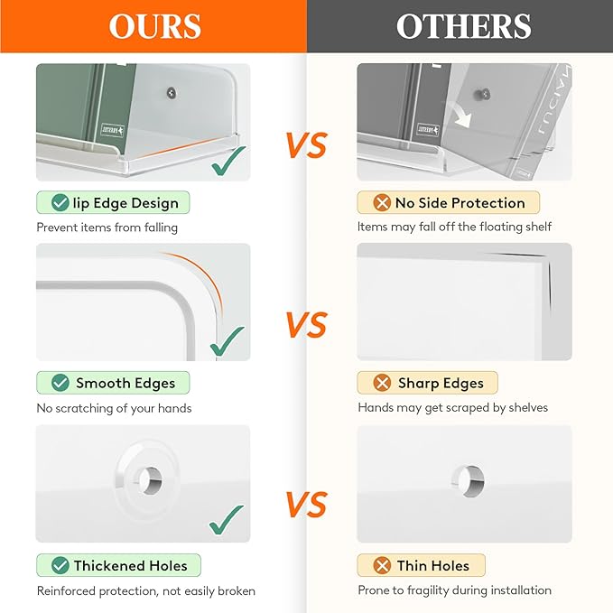 - 2 Ways to Install: The two hanging options are upward or downward. Acrylic shelves come with pre-drilled holes, detailed instructions, and all necessary mounting hardware, including screws, wall anchors, and bubble lever, which make installation simple and easy in just a few minutes.