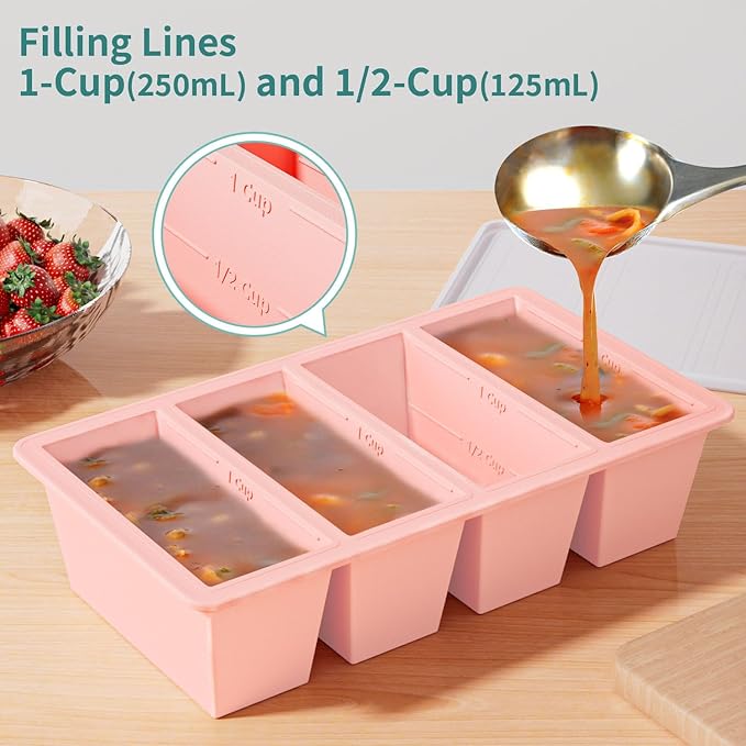 - PERFECT PORTION CONTROL SOUP STORAGE: Each cavity has the ½cup, 1-cup, 125 mL and 250 mL measurements marked inside. This is a neat way to freeze in accurate size portions. Soup cubes freezer tray is perfect for batch cooking and having leftovers frozen for later use. Freezer soup containers is a must for anyone who batch cooks soup or broth.