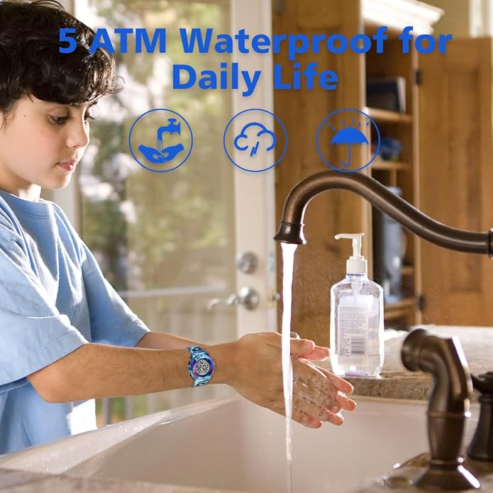 - ⛳【50M Waterproof Resistant】It has 50m(5ATM/150FT) waterproof performance, children wearing this waterproof watch can be splashproof and rainproof outdoors or playing, happy and free. Be careful the watches for kids not to operate the buttons in sauna, bathing, or diving.
