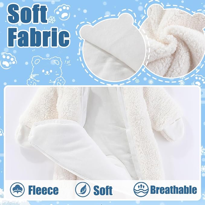 • 🐻【Warm Design】 The infant winter thick fleece hoodie footie one-piece design, the baby's head and ears can be wrapped. Baby winter snowsuit with hands and foot wrap, which keep baby's hands and feet warm when going out, perfect for cold winter.