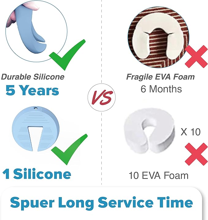 - 𝐋𝐨𝐧𝐠 𝐒𝐞𝐫𝐯𝐢𝐜𝐞 𝐓𝐢𝐦𝐞: Neobay finger pinch guard is made from durable silicone which can serve up to 5 years, about 10 times longer than foam door stopper. Perfect for continuously protecting the little hands and fingers of your baby, toddler, or child from getting pinched or jammed due to a door closing.