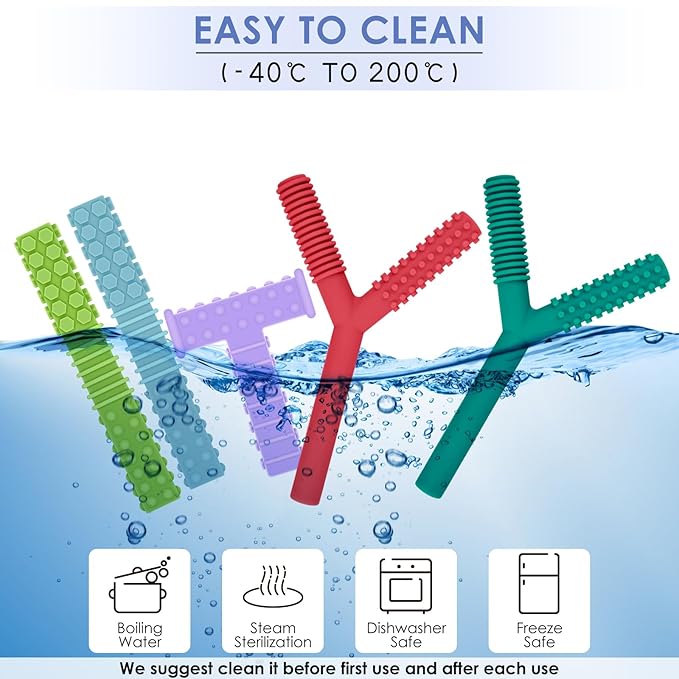 - FUN TEETHING TOYS: Our sensory teething toys set includes 1 pcs T shaped, 2 pcs Y shaped sensory chewy toys and 2 pcs teething tubes, helps keep your kids from chewing on fingers, pencils, hands, clothes, hairs, etc. Reducing stress, anxiety especially when they need to soothe, calm, or focus