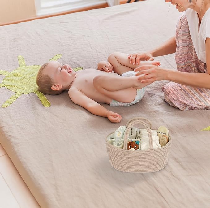 - Flexible and Portable Diaper basket with removable divider: Featuring handles for effortless transportation, our diaper change caddy includes removable dividers for personalized organization. Adjust the internal layout as needed to accommodate various baby items. Move seamlessly from room to room or take diaper organizer caddy on the go for convenient access to baby essentials.