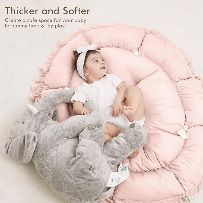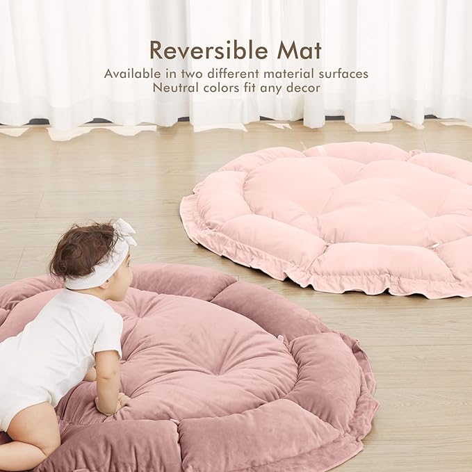 - THICKER & SOFTER: The reversible play mat crafted from premium plush material, offers a fantastic amount of cushion. Its neutral color scheme blends in with your home’s aesthetic so you can keep it out even after playtime is over.