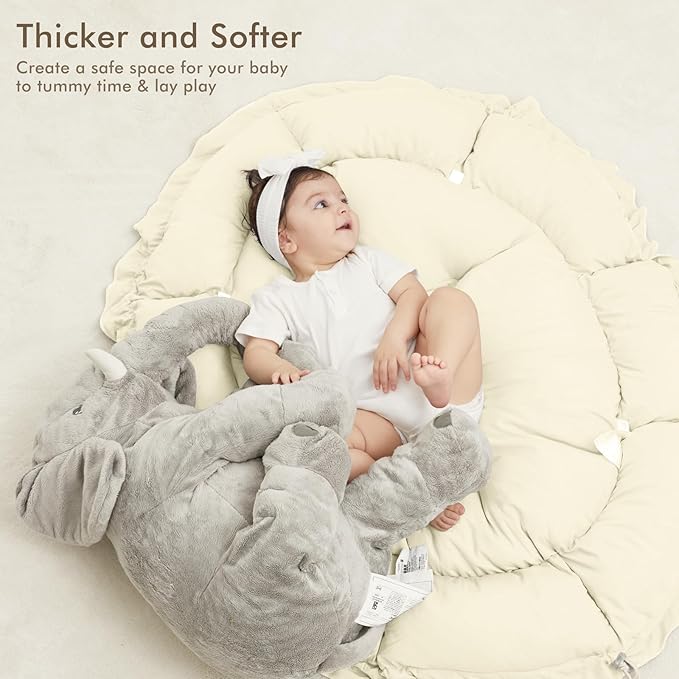 - THICKER & SOFTER: The reversible play mat crafted from premium plush material, offers a fantastic amount of cushion. Its neutral color scheme blends in with your home’s aesthetic so you can keep it out even after playtime is over.