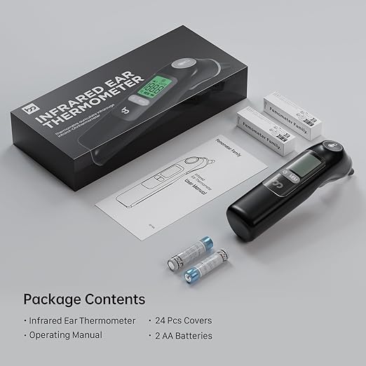 - WHAT YOU GET: Package includes an ear Thermometer, 24 disposable ear muffs, 2 x AA batteries, user manual and a quick guide in your local language, you will also get a 1 year replacement/repair service, during this period, any problem with the product, our customer service team will do their best to help you!