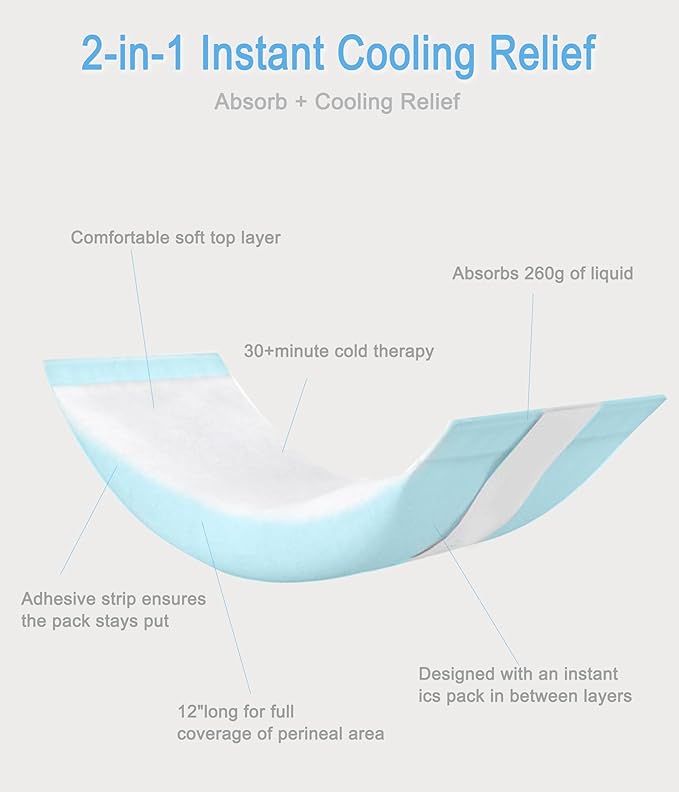- Cold Soothing Pads: Postpartum ice pads features cold soothing and absorption effect, which is easy to use, once folded in half, two separate bladders in the pad break and offer instant cooling relief. They are highly absorbent, able to soak up to 260 grams of fluid. With a length of 12 inches, they fully cover the perineal area for maximum comfort. These ice pack pads are portable and ideal for home use after leaving the hospital.