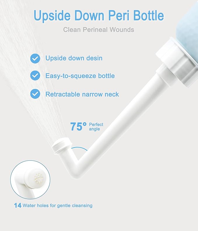- Large Capacity Upside Down Peri Bottle: No need to bend down to spray the right spot with ergonomic 75° angle labor delivery postpartum women care 500ml peri bottle, it has a long nozzle that can reach the area you want to cleanse easily, spraying yourself will be easier than hospital style bottle. Bottle lid allows for leakless water transport, easy and gentle cleansing with 14 spray holes.
