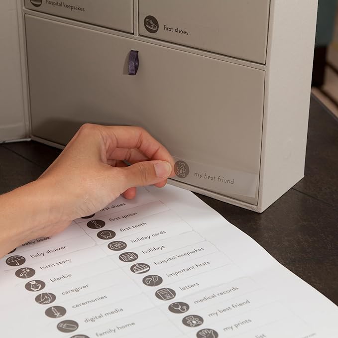 - Bespoke system for custom keepsake storage: Choose from 52 hand-illustrated labels that show what to save and where to find it. Personalize baby’s memory box with included acetate letters or your baby’s photos.