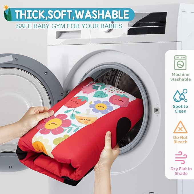- Soft, Safe, and Washable - The baby gym play mat is made from high-quality fabrics, thick, delicate, and smooth touch, safe and comfortable for baby skins. Machine washable, easy to clean and keep hygienic. The tummy time activity mat can also be used directly on the floor, providing cushioning and protection for the baby. The balance of flatness and softness makes it more stable for babies to sit, stand and crawl.