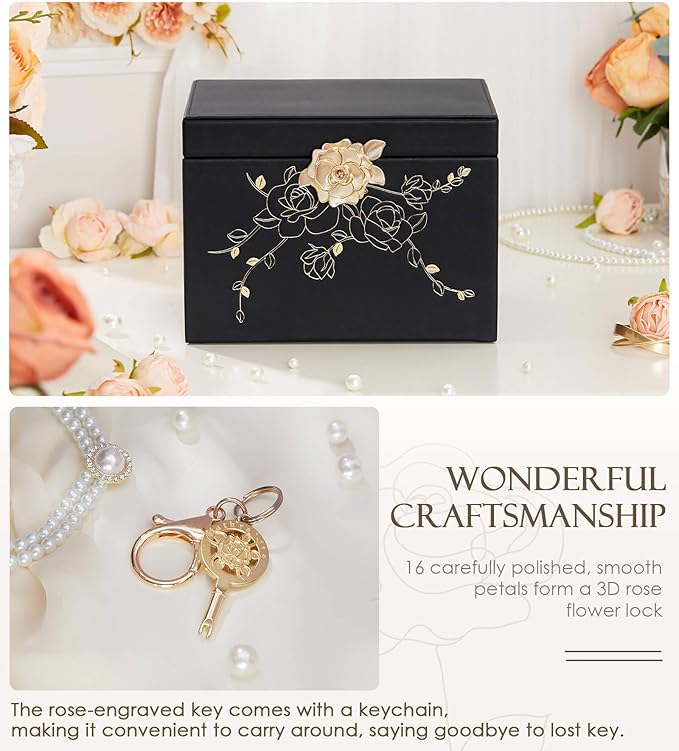 - Leather-Like Design with Lock: The jewelry box's faux leather-inspired design with golden rose accents and a lock ensures both style and security for your treasures.