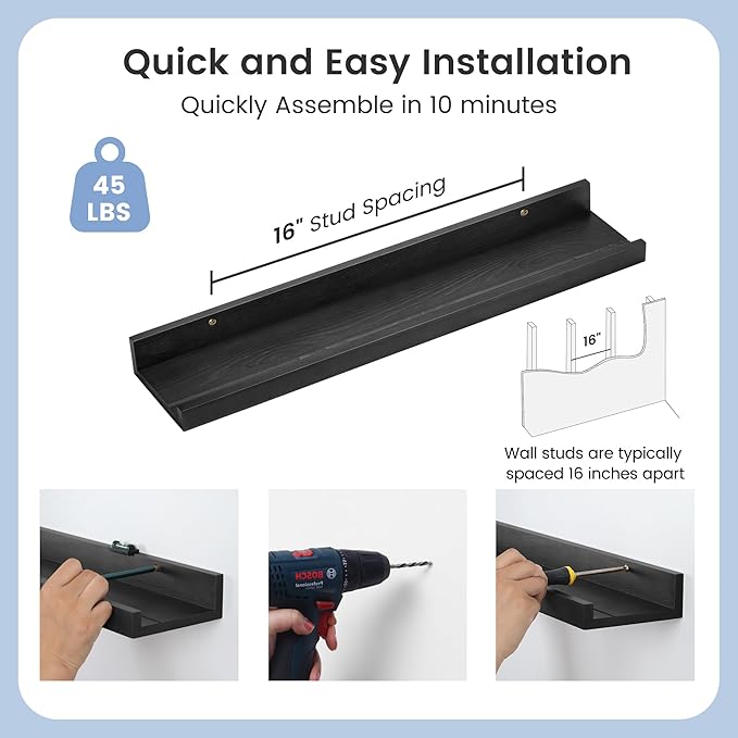 - Easy to Install: You will get a level, screws for the wall, drywall anchors, a detailed installation guide, and two beautiful hand-crafted solid pine wood shelves. With the level, you can make sure your picture ledge shelves are well aligned. Just follow the simple instruction to install the hanging shelves for wall decor within 10 minutes. We add additional screw and anchor to the hardware bag just in case. If you have any questions about our products, please feel free to contact us
