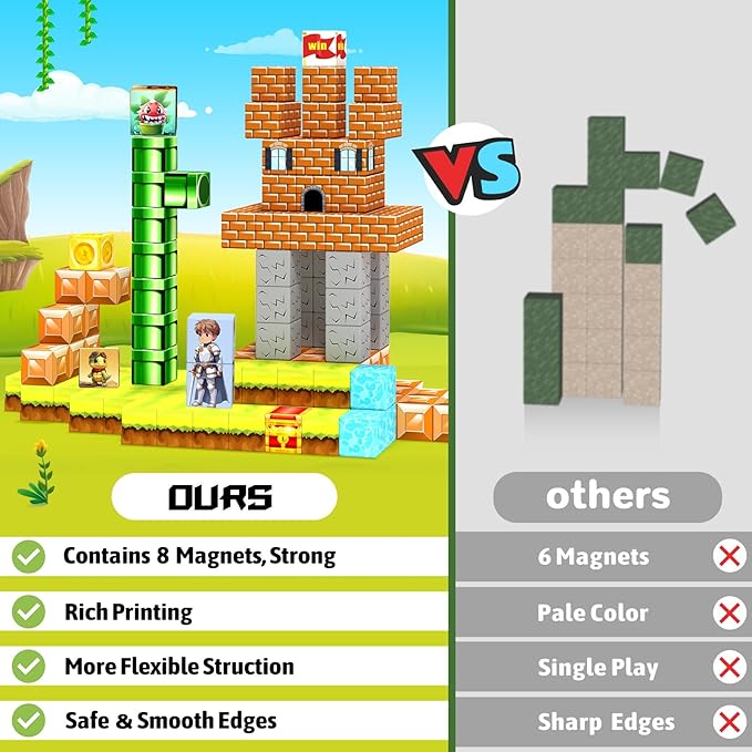 - 【Magnetic Blocks】Let's embark on an adventure with magnetic building blocks! Spark the imagination of children with our magnet blocks toys, perfect for kids ages 4-8. These magnetic blocks encourage open-ended play, allowing kids to construct, demolish, and rebuild as they please.Safe,durable,and designed for little hands,with super strong internal magnetic, which is easier for toddlers ages 3+ to stick the cubes together and make builds sturdy.
