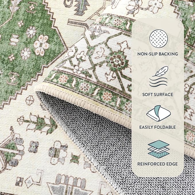 Lahome Boho Indoor Rugs for Entryway - 2x3 Area Rug Non-Slip Backing Washable Inside Door Mats Low-Profile Throw Rugs for Bathroom, Vintage Print Distressed Rug for Kitchen Bedside (Green, 2'x3')