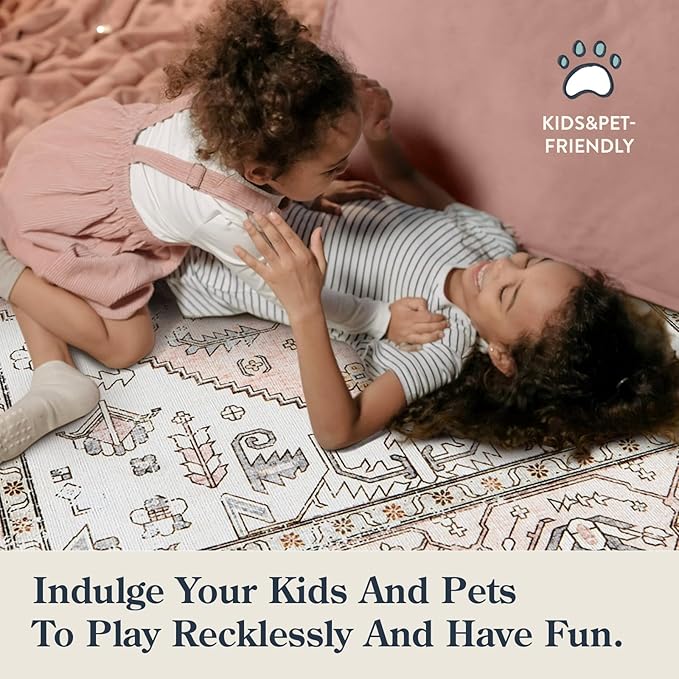 Lahome Boho Washable Living Room Area Rug - 3x5 Small Pink Rugs for Bedroom Non-Slip Throw Nursery Kids Room Rug, Vintagel Print Carpet Rug for Kitchen Office Bathroom Laundry Room (Pink, 3'x5')