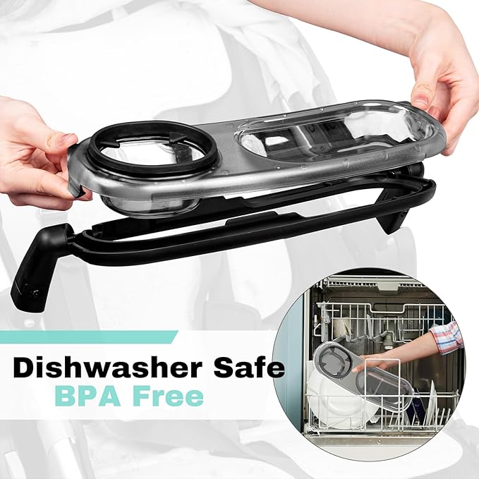 - 【Easy to Clean】The stroller tray is made of BPA-free polyester plastic. You can simply wipe it off or take off the top tray and place it directly in a dishwasher for cleaning.
