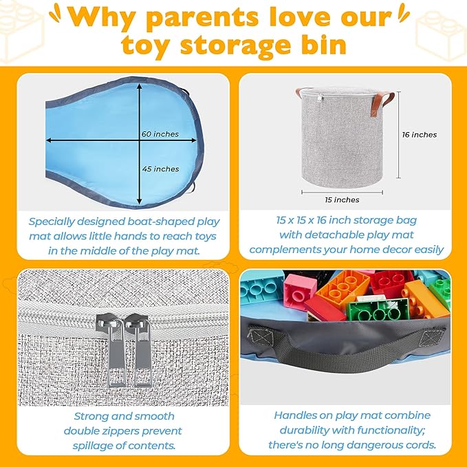- Safe, Functional And It Has Zippers – There are no tangly cords or buttons to worry about, making it safe for kids of all ages. Our play mat has durable handles for tipping the toys back into the storage bin. We have also included double zippers on the lid so that nothing can spill out accidently. Warning: Children below 3 years of age must be supervised when using this storage bin and its play mat.