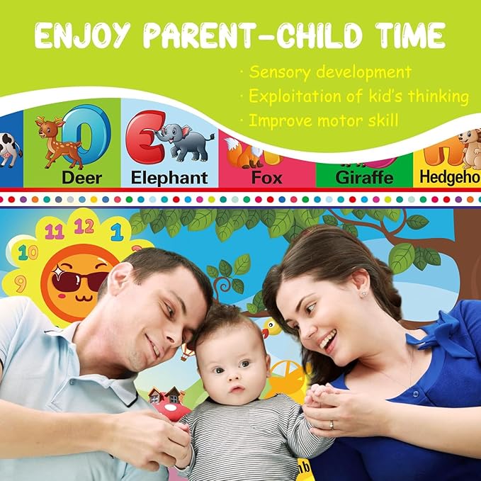 - EDUCATIONAL FUN - Our classroom mat features an engaging alphabet design, with each letter represented by a corresponding animal object. It also includes numbers around the cute sun, various shapes in vibrant colors loaded by a truck, and a rotating disk with months. This baby play mat promotes early education in an exciting way.