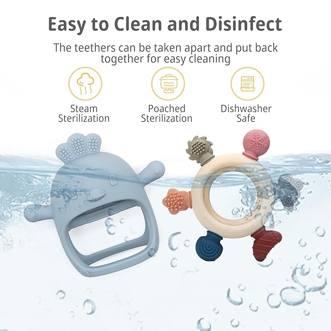 - Easy to Clean: Our baby rattles and teething toys are easy to clean and resist dust and hair. Boil, freeze, or toss in the dishwasher then rinse and reuse. These convenient, baby-safe tools fit into any busy routine with ease