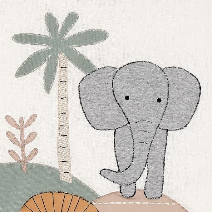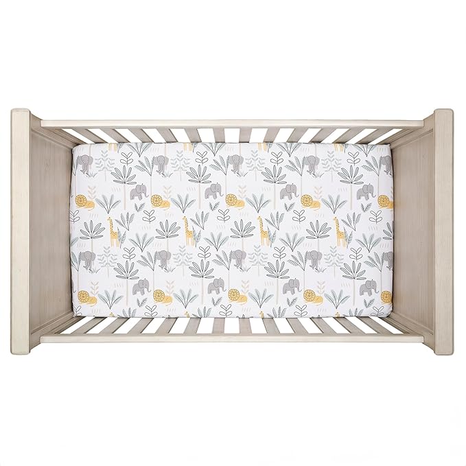 - Breathable 100% cotton fitted crib sheet with lions, giraffes, elephants and foliage