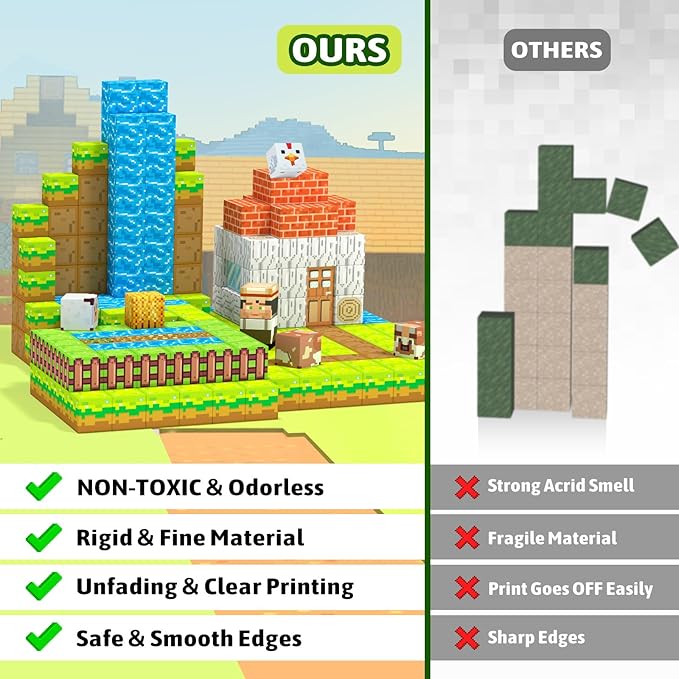 - ● Magnetic Blocks Farm Life Set: Step into a delightful world of rural life with our magnetic building blocks set! Featuring a little farmer, along with cute animals,vibrant crops,torches..Kids can create their own bustling farm with magnetic blocks.Unleash your children's creative thinking as they explore farm life and enjoy hours of imaginative role-play fun!