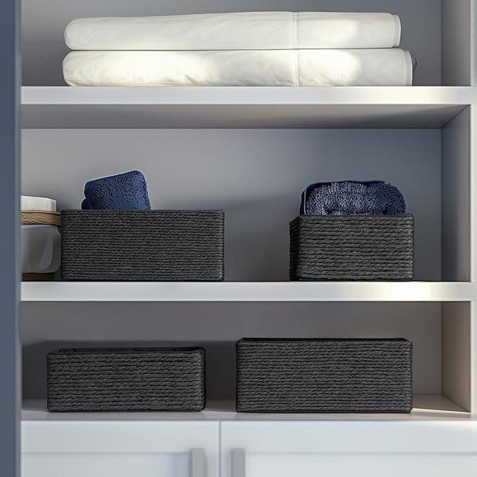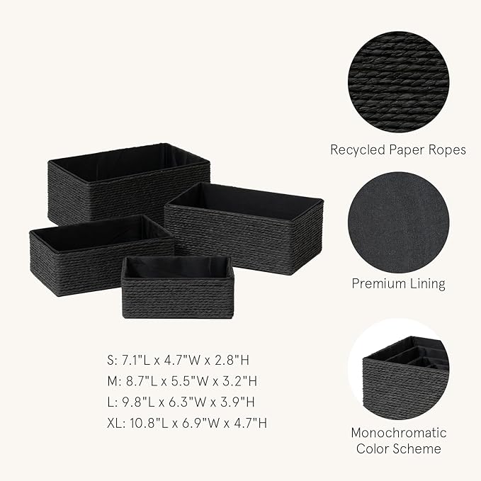 LA JOLIE MUSE Storage Baskets Set 4 - Sturdy Woven Paper Rope Decorative, Stackable Wicker Baskets for Makeup Closet Bathroom Bedroom (Ebony Black)