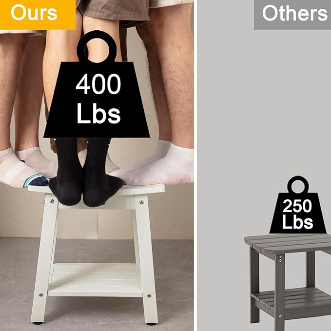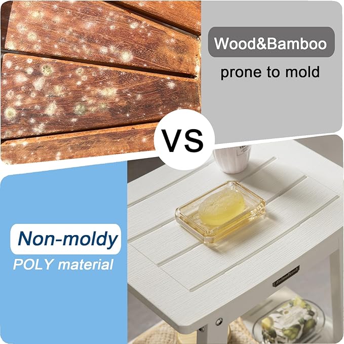 - 【Material & Size】Our poly shower bench is made of HDPS (polystyrene) with 304 stainless screws which never gets rust, this material is not easy to get rotting or crack after prolonged exposure to humidity, no splinters and no maintenance, 16 x 12.6 x 17 Inches enough large to sit (THE MOST IMPORTANT IS NO MAINTENANCE)