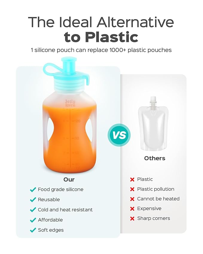 - Durable and Reusable: These refillable baby food pouches are made from high-quality silicone for long-lasting use. Reusable design reduces waste and promotes sustainability