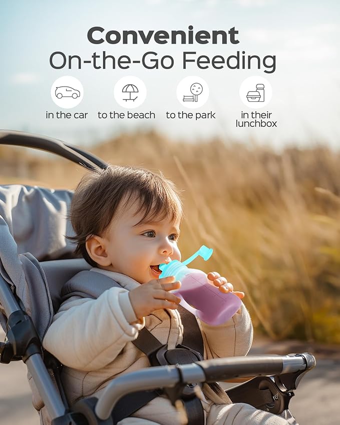- Includes Straws and Side Handles for Easy Feeding: These reusable yogurt pouches for kids are equipped with a detachable straw and side handles for convenient and mess-free feeding. Specially designed to support kids' independent eating and grasping skills development, the X cross-cut valve can adjust the food flow, allowing babies to eat safely at their own pace. The lid is attached to the spout, which means that you won't have to worry about the lid being lost