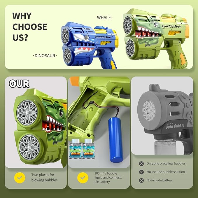 - Upgrade blue shark Bubble Gun - The newly upgraded bubble holes, pull the trigger, are full of power, and bubbles are produced crazily. Thousands of bubbles can be produced every minute, doubling the fun! This bubble machine box contains two bubble machine guns of different colors, and the cute dinosaur shape makes children put it down