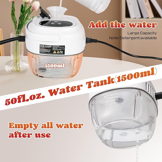 - 【Large Water Tank with Outlet】This upholstery steam cleaner is equipped with a large water tank of 50 oz./1500ml capacity, allowing you to focus on cleaning instead of constantly refilling water (also supports adding water during operation). Besides, the water tank has a bottom outlet, so the portable steam cleaner can keep dry without breeding bact and producing odors