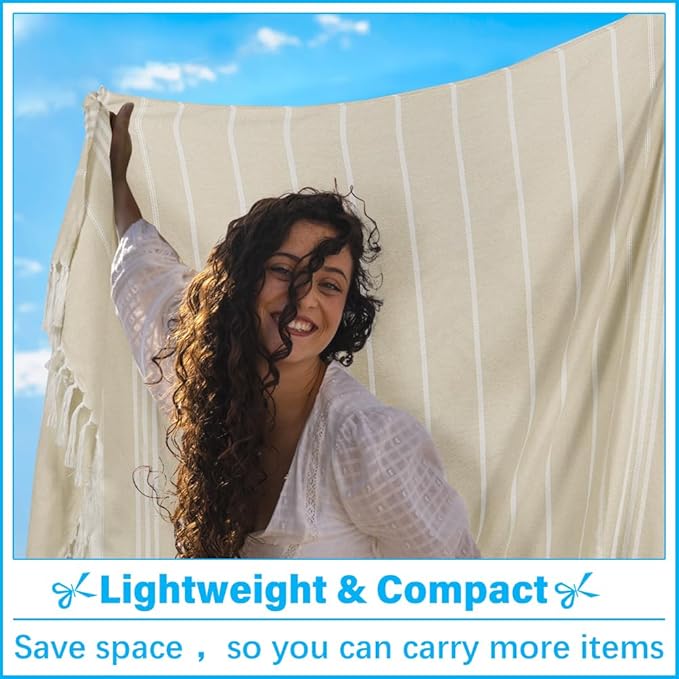 - LIGHTWEIGHT AND PORTABLE:Despite its large size,this turkish beach towel blanket is lightweight and thin,making it easy to fold and carry.Made from soft yet comfortable materials,it won’t weigh down your beach bag.Its compact design fits neatly into luggage or a backpack,perfect for travel and outdoor adventures