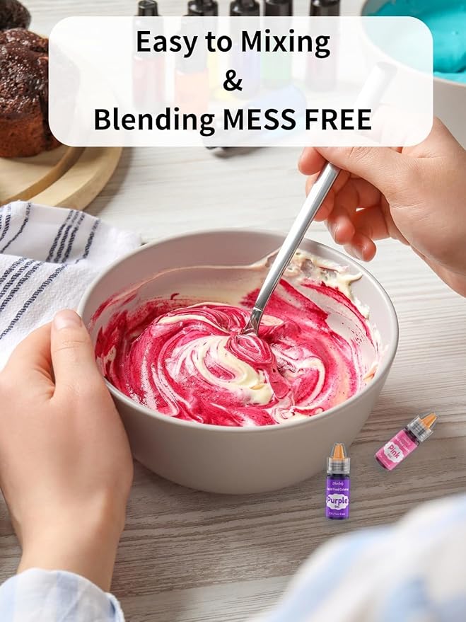 - Vibrant Lasting Shades & Vivid Colors -- Our highly concentrated dye free food coloring provides vibrant shades that won't fade out after baking. Add color to cake batter, buttercream frosting, or royal icing without changing the consistency.