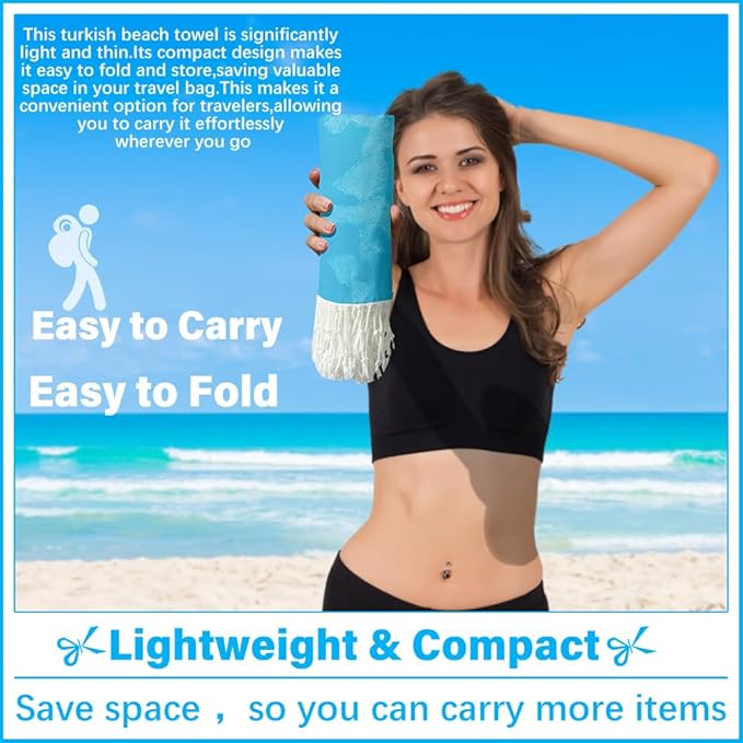 - LIGHTWEIGHT AND PORTABLE:Despite its large size,this turkish beach towel blanket is lightweight and thin,making it easy to fold and carry.Made from soft yet comfortable materials,it won’t weigh down your beach bag.Its compact design fits neatly into luggage or a backpack,perfect for travel and outdoor adventures