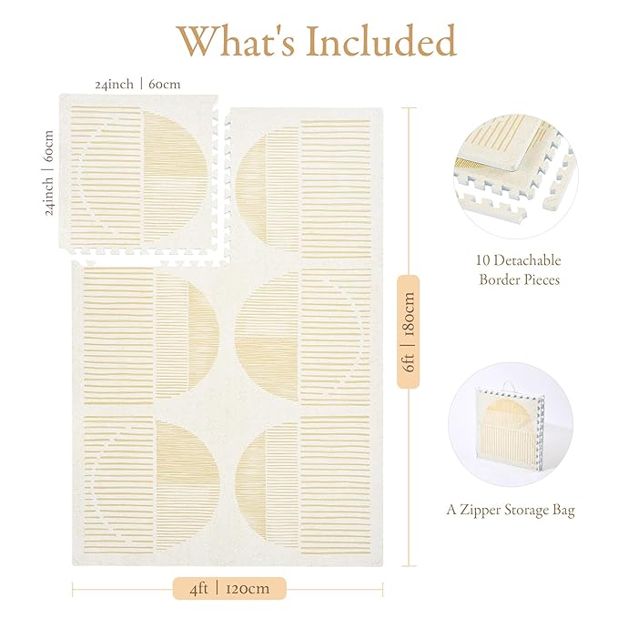 - 【Enhanced Specifications】Include 6 interlocking 24x24x1 inches tiles & 10 border pieces. Each 1-inch thick tile weighs 800g, offering stability and security. The mats cover a large surface area, making them perfect for any playroom or nursery. They are ideal for high-traffic areas, providing a robust and reliable play surface for your children. To maximize both the aesthetics and functionality of your play mat, choose a size configuration that covers the entire room/space.