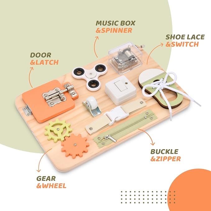 - Learning Toy for Toddlers: Ignite your little one’s curiosity with our Montessori Busy Board. This baby & toddler toy is crafted to elevate early developmental skills through sensory play, fostering hand-eye coordination, cognitive abilities, and problem-solving prowess.