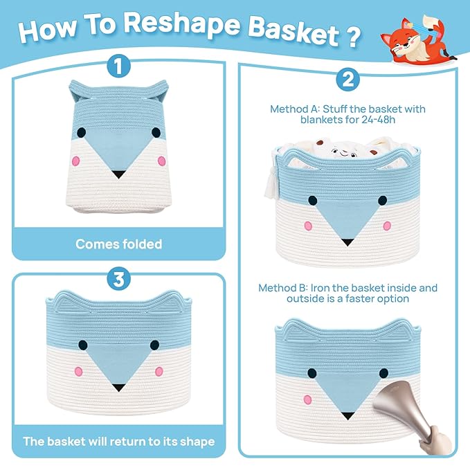 - 【Note】The baby blanket baskets arrive folded, but please don’t worry—this is not a quality issue. You can check out the videos we uploaded. Fill it with blankets and quilt in 24 to 48 hours to make it look round. Then iron the creased places inside and outside the basket. It'll get back to its best shape. This is a basket you’ll use for years. We’ve put a lot of care and love into designing these baskets, and you can trust the quality and craftsmanship.