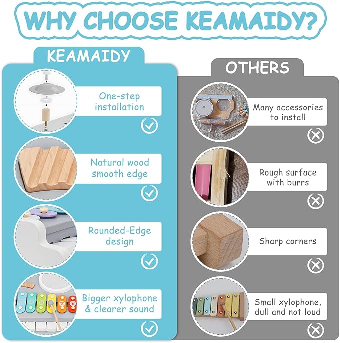 - 5-in-1 Music Toys: 5-in-1 early music educational toys with piano, drums, cymbals, tone blocks and xylophone. It's designed to spark children's interest in music, improve hand-eye coordination, and foster rhythm and creativity.