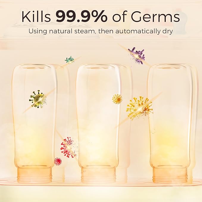 - Designed with a fully automatic operation and LED countdown display, the bottle sterilizer is easy to use and ensures precise and safe sterilization. Its spacious design allows for the sterilization of up to 8 bottles at once.
