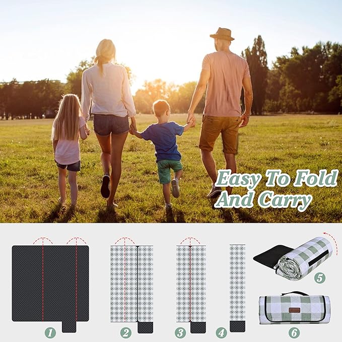 HX&OD Outdoor Picnic Blanket, Extra Large, 80''x80'' Waterproof Foldable Blankets Gingham Picnic Mat for Beach, Camping Grass Lawn Park Accessories Cute Couple Ideas Wedding (Green, 80”x80”)