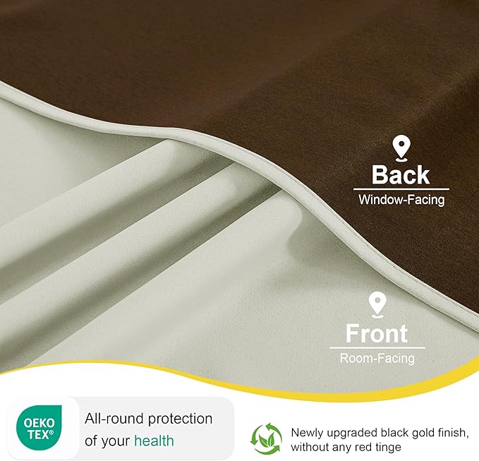 - ROOM DARKENING: These curtains are manufactured in a STANDARD 100 certified by the OEKO TEX factory. The curtains made by black gold bottom covering technology. Non-coated, Non-chemical, which can block out 85%-95% bright sunlight and UV ray, bring you a full room darkening environment for good night sleep, afternoon nap and weekend lie-ins.