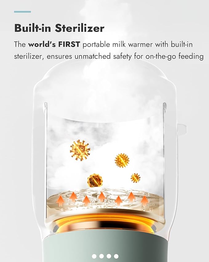 - Built-in Sterilizer & Safe Materials: The world's FIRST portable milk warmer with built-in sterilizer, helps maintain hygiene without extra tools. The warming chamber is made of FDA-compliant food-grade stainless steel — safe for breastmilk/ formula.