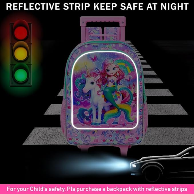 - Eye-Catching Design: This girl rolling backpack is made of new uv printing technology, interesting and fun, the cute mermaid shines. The high quality eco-friendly water-resistant fabric makes kids wheeled backpack perform better.