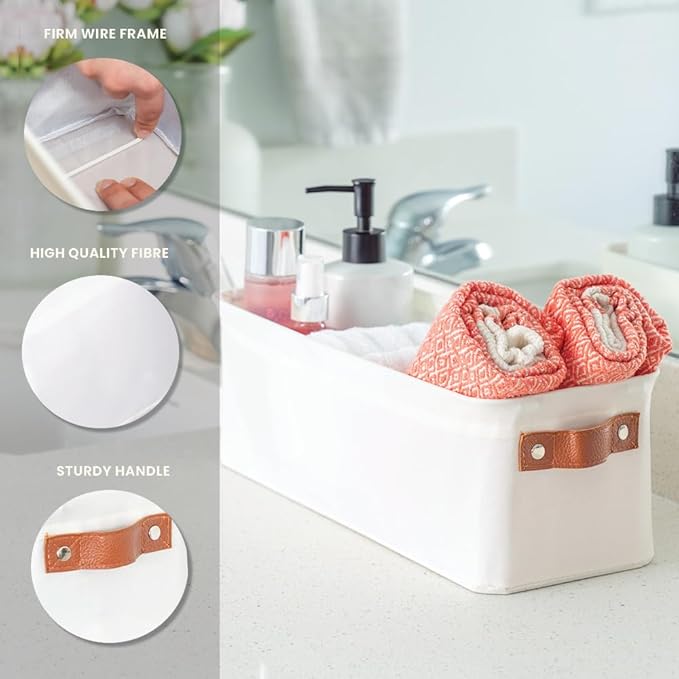 - Decorative Fabric and Vegan Leather – These versatile storage baskets for organizing your everyday life are made with a thick, high-quality fabric and fitted with leather handles to add a stylish touch to a living room, bedroom, office, or personal space.