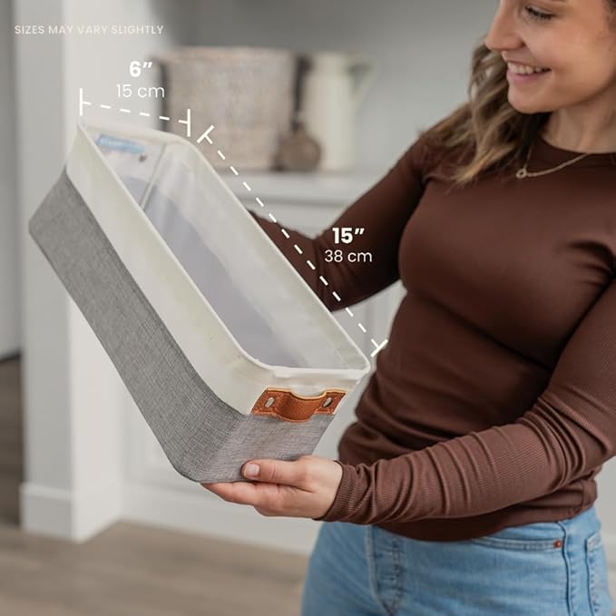 - Decorative Fabric and Vegan Leather – These versatile storage baskets for organizing your everyday life are made with a thick, high-quality fabric and fitted with leather handles to add a stylish touch to a living room, bedroom, office, or personal space.