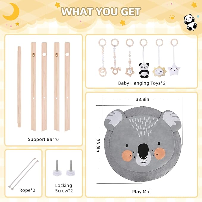 Baby Play Gym with Mat – Wooden Montessori Gym for Newborns 0-12M,Natural Pine Wood with 6 Sensory Toys,Foldable & Portable (Koala)