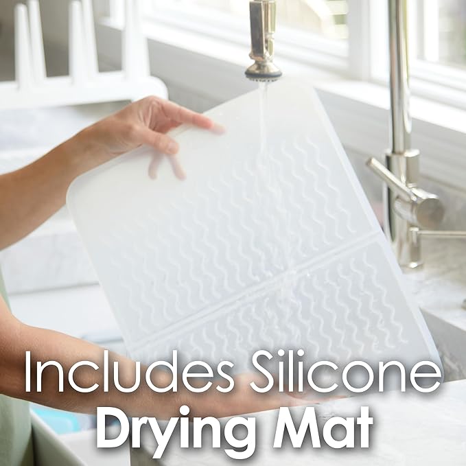 - ✅ BEAUTIFUL SPACE SAVING DESIGN: Great for air drying everyday items like plastic bags, cups, baby bottles, tumblers and most items which are not dishwasher safe. The compact drying rack sits near the back of your counter, leaving the front counter area available for use. The silicone drying mat keeps moisture off of your counter–the clear frosted mat works with ALL countertop colors and folds in half for easy storage.