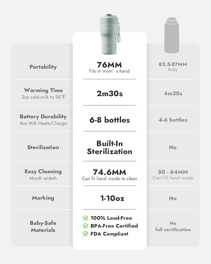 - Built-in Sterilizer & Safe Materials: The world's FIRST portable milk warmer with built-in sterilizer, helps maintain hygiene without extra tools. The warming chamber is made of FDA-compliant food-grade stainless steel — safe for breastmilk/ formula.